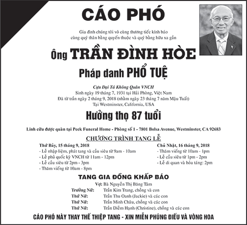 Hơn một năm sau, cựu Đại tá Trần Đình Hòe, nguyên Tư lệnh phó Sư Đoàn 5 KQ, qua đời vào ngày 2 tháng 9 năm 2018 tại California, hưởng thọ 87 tuổi.