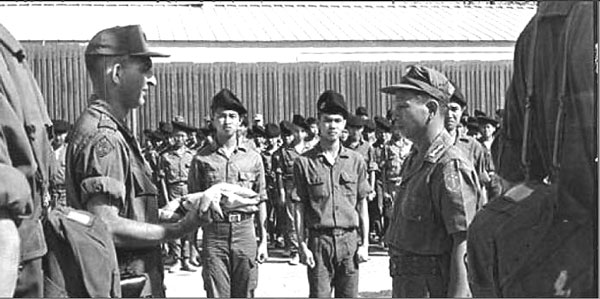 Đại diện quân lực Hoa Kỳ (trái) trao đổi Quốc Kỳ với Chỉ Huy Trưởng TSQ VNCH Nguyễn Văn Ưng (phải).