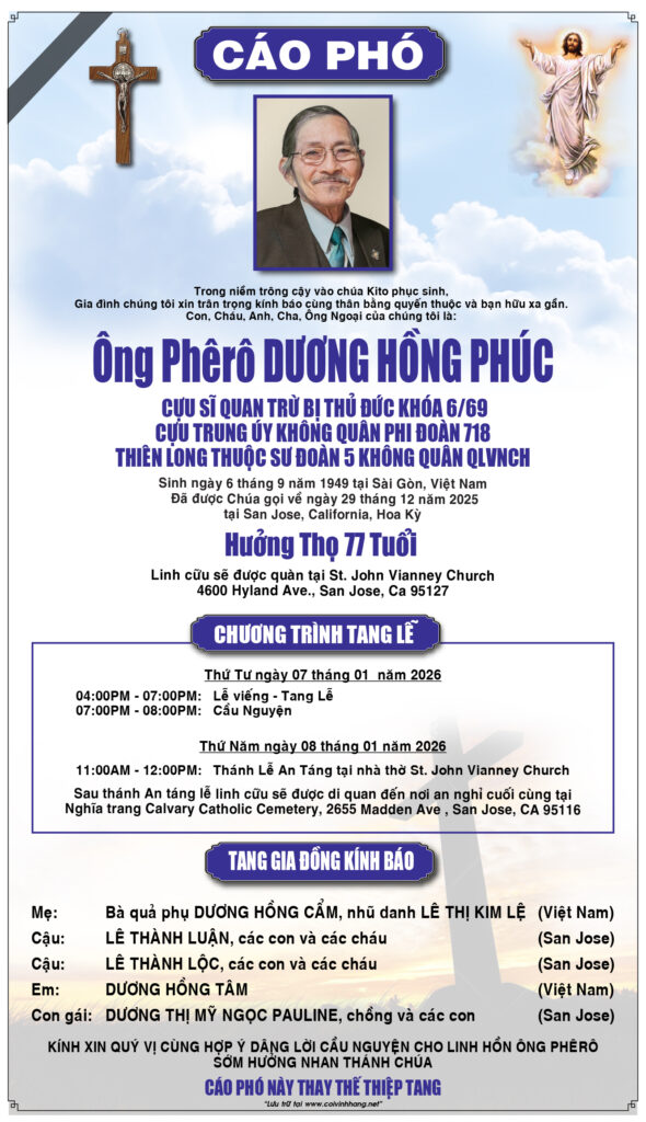 KQ DƯƠNG HỒNG PHÚC, đã bay vào Hư Vô Ngày 29 Tháng 12 Năm 2025 tại San Jose'
