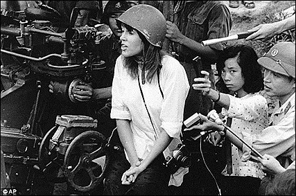 Jane Fonda đang hát một bài hát phản chiến trong lúc ngồi trên xe tăng phòng không của Bắc Việt vào tháng 7 năm 1972. Mặc áo bà ba và quần đen, bà nói đã đến Hà nội để “khuyến khích” quân đội Cộng sản, nhưng hiện nay bà công nhận chuyến đi này  là một “sự phản bội”