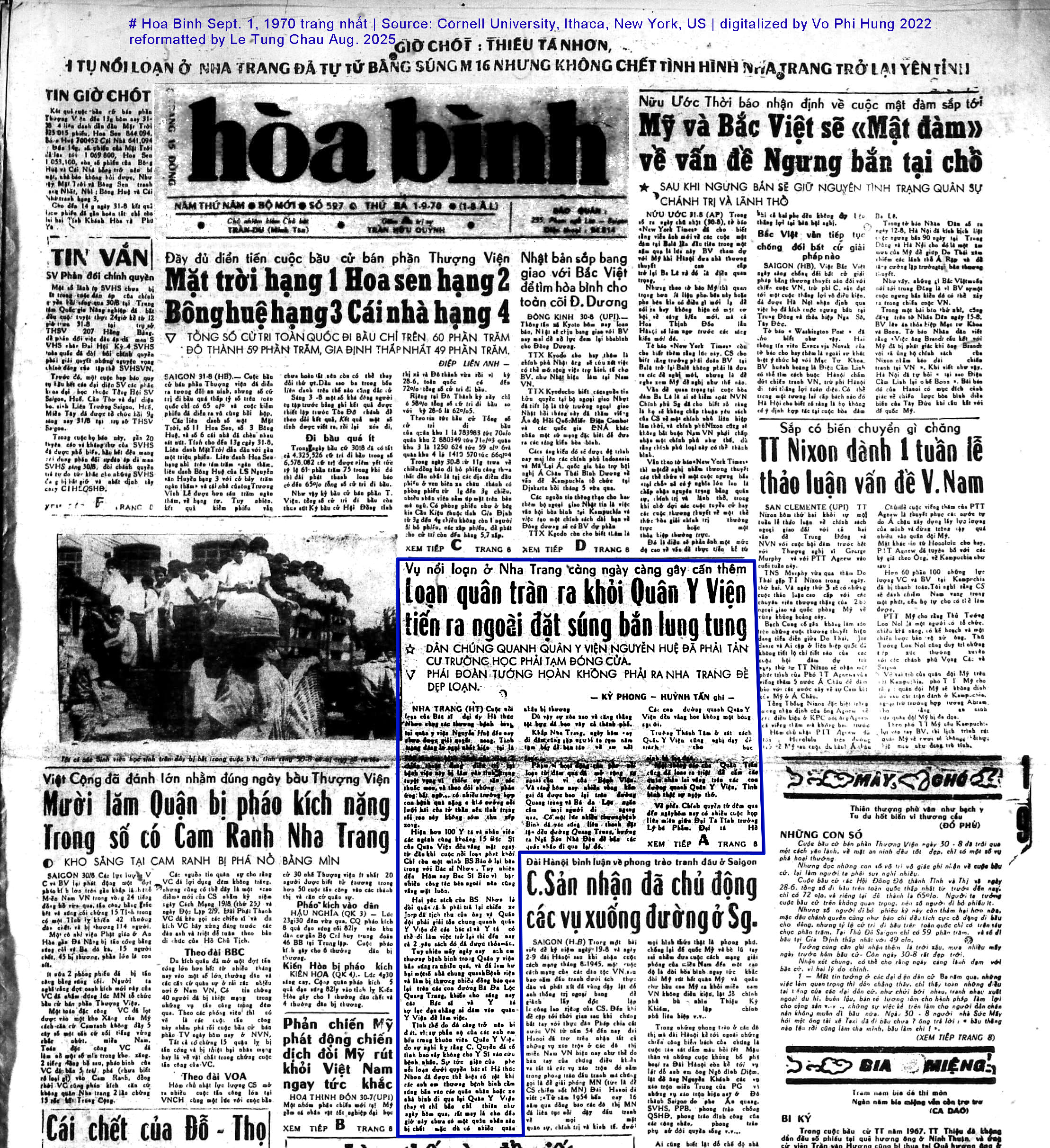 Hoa Binh Sept. 2, 1970 trang nhấtPhát Ngôn Viên Chính Phủ nói về vụ nổi loạn ở Nha Trang