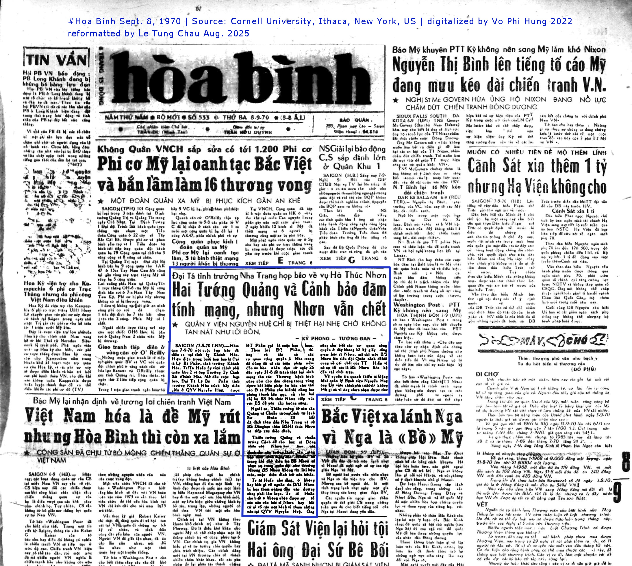 [ * ] TV chữ viết tắt của Tin Việt, là hãng tin mà báo Chính Luận, Tiền Tuyến rất hay lấy về đăng lại. Riêng bản tin này, TV đã đăng một tin vịt (tin không có thực, chưa được xác thực = fake News), bạn đọc xem bản tin của #Tien Tuyen Sept. 9, 1970 dưới đây sẽ rõ.