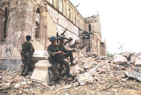 Ngay cả nhà dân chúng chung quanh nhà thờ, dân thì đã di tản đã lâu, từ đầu trận đánh, bây giờ chẳng còn thằng nào bén mảng đến đây.