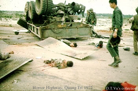 Trên mặt đường và cả hai bên vệ đường, bên cạnh xác người là lỗ chỗ các hố sâu của đạn súng cối, đại bác, hỏa tiễn mà giặc cộng đã nhẫn tâm rót xuống để giết hại đồng bào và những trẻ thơ vô tội.