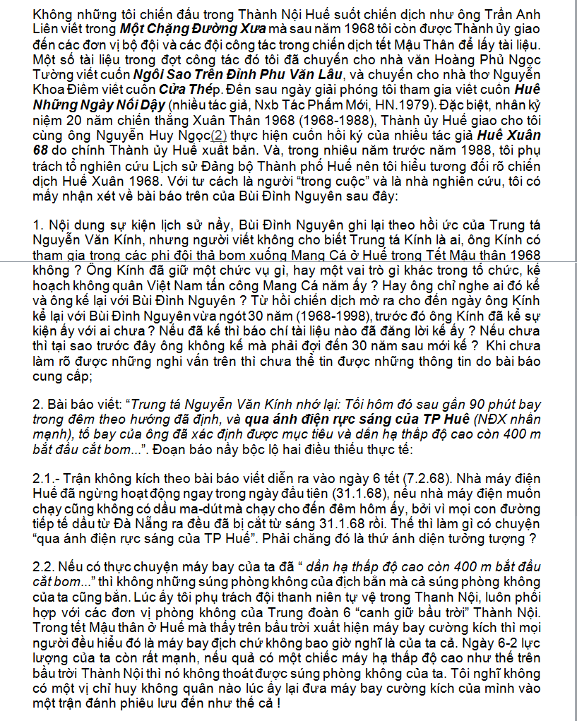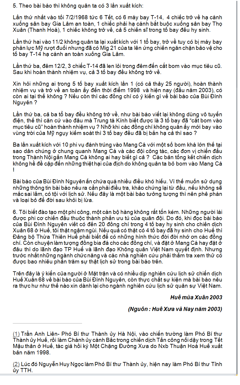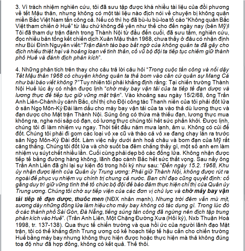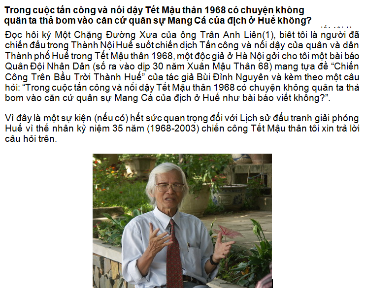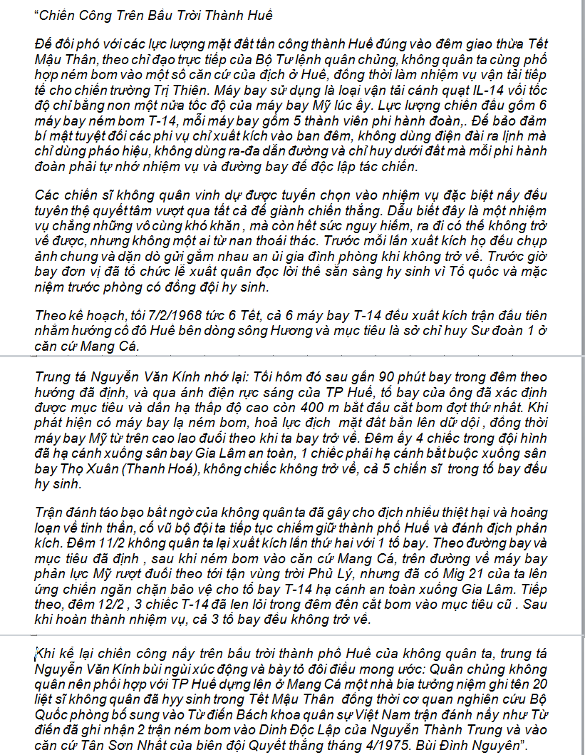 Trang gactholoc của nhà Huế học Nguyễn Đắc Xuân nói về sự kiện này đã bị 'treo'. Xin thay thế bằng hình ảnh bài viết Kêu Trời Không Thấu của Nguyễn Đắc Xuân và những trang web của đảng ta nói về sự kiện lịch sử có một không hai của Không quân Bắc Việt đã góp phần chiến thắng trong trận tổng tấn công Tết Mậu Thân 1968 tại Huế: