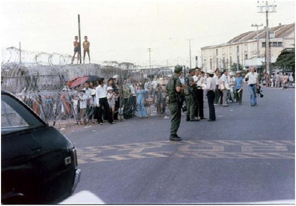 Họ nhảy lên băng ghế trên, rồi tôi chạy thẳng sang DAO. Cổng DAO có rào cản, nhưng không hỗn độn . Những quân nhân thủy quân lục chiến và vài người Mỹ dân sự, chặn xe tôi.