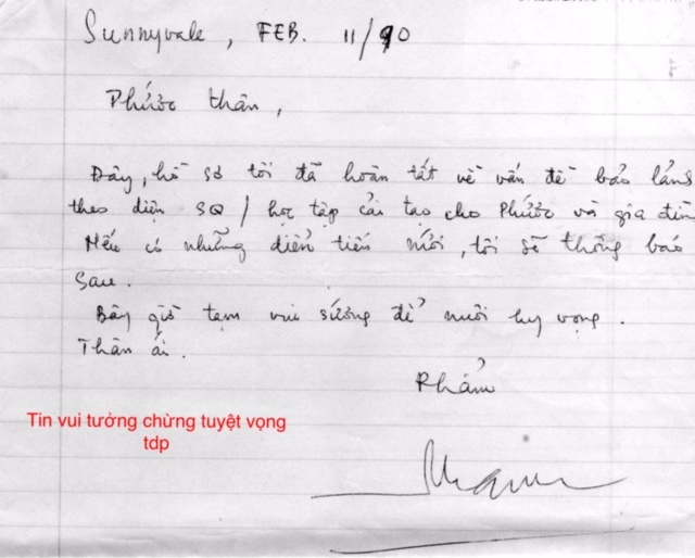 Đang lo lắng thì nhận được thư anh gửi về hỏi tôi có biết chương trình HO hay không? Tôi có nộp đơn đi theo chương trình này không? Nếu có thì hãy thư ngay cho anh biết để anh làm thủ tục bảo trợ.Tôi mừng quá, vội thư ngay cho anh là đã nộp đơn, nhưng chưa có ai bảo trợ. Anh yêu cầu tôi gửi những giấy tờ cần thiết, rồi anh đến nhờ cơ quan USCC ở San José tiến hành thủ tục bảo trợ. Với tư cách là Sponsor, anh sẽ chịu hoàn toàn trách nhiệm khi nào gia đình tôi đến San José.