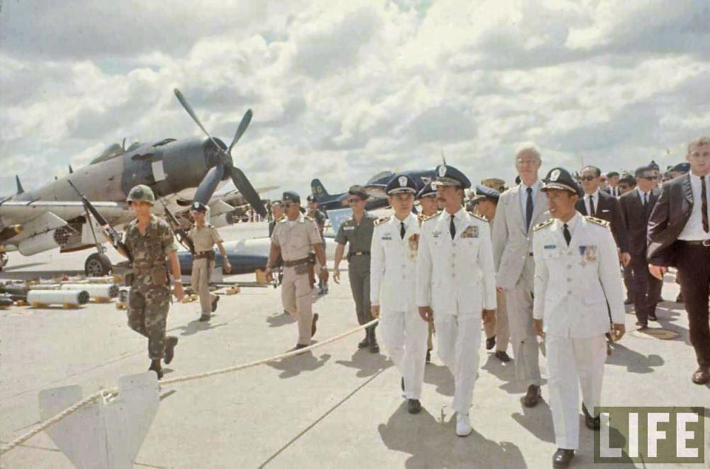 Thiếu tướng Nguyễn Cao Kỳ, Tư lệnh KQVN, Trung tá Từ Văn Bê, Tư lệnh KĐKTTV. Đi phía sau là Đại sứ Mỹ Ellsworth Bunker