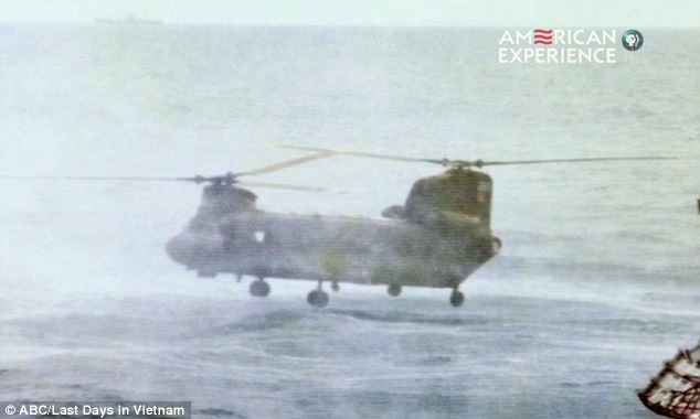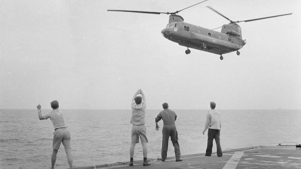 Crew members of the USS Kirk try to wave off a CH-47 Chinook carrying South Vietnamese refugees on April 29, 1975. But the helicopter's pilot, Ba Nguyen, was determined to unload his passengers, who included his wife and three young children.