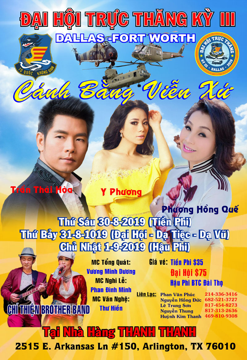 Xin thưa, Đại hội do một số anh em trong ngànhTrực Thăng tại Dallas tổ chức không có nghỉa là chúng tôi chỉ tiếp đón anh em trong ngành Trực Thăng mà thôi, ngược lại chúng tôi rất hân hoan và hãnh diện được có sự hiên diện của tất cả Quý Niên Trưởng cùng Quý Chiến hữu mọi ngành nghề trong Đại gia đình Không Lực VNCH, vì chúng ta là một tập thể bất khả phân.