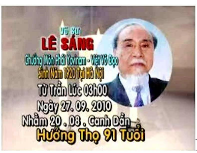 Bây giờ, cụ Lê Sáng đã ra người thiên cổ. Cụ thọ 91 tuổi. Trong bức hình chụp Võ sư Lê Sáng mà các bạn ở Việt Nam gởi cho, tôi thấy đôi mắt võ sư Chưởng môn Việt võ đạo vẫn sáng quắc như ngày nào. Tôi viết những kỷ niệm trên với Võ sư Chưởng môn Việt Võ Đạo trong thời ở tù để gọi là đại diện cho một số anh em cựu tù của trại Hàm Tân Z-30C, A-20 và Z-30A bái vọng cố quốc để tiễn đưa cố võ sư Chưởng môn đồng thời là một người bạn tù đáng kính trọng từng chia sẻ với anh em chúng tôi những năm tháng đen tối của lịch sử Việt Nam.