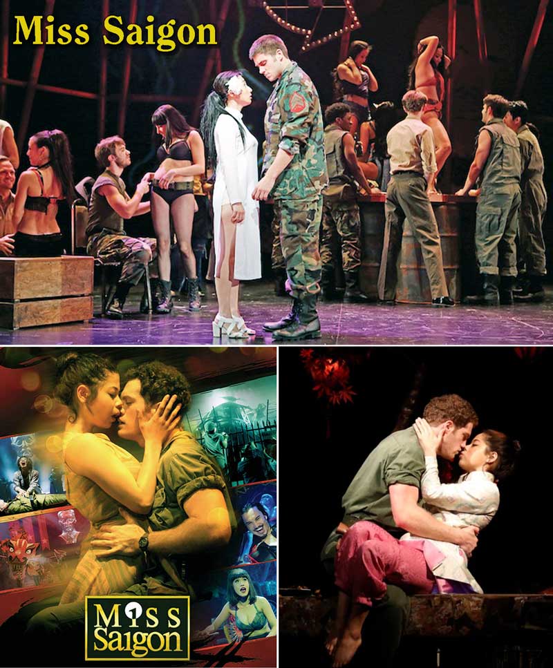 Vở nhạc kịch (Opera, Musical Theatre) “Miss Saigon” từng gây tiếng vang một thời trên thế giới được thực hiện với hai nhạc sĩ Pháp Claude-Michel Schonberg (nhạc), Alain Boublil, Alain Boublil và lời Richard Maltby, Jr. Đạo diễn Anh Cameron Mackintosh dàn dựng công phu, tốn kém trong lịch sử nhạc kịch. Với các diễn viên ban đầu Lea Salonga (Kim), Simon Bowman (Chris), và Jonathan Pryce (The Engineer), Peter Polycarpou (John), Claire Moore (Ellen), Isay Alvarez (Gigi), Keith Burns (Thuy), Monique Wilson (cô gái quán bar), Alvin Cousins (Tâm) và nhiều nhân vật phụ. Các ca sĩ diễn viên và trình bày bao gồm Claire Moore (Ellen), Hinton Battle (John) và Monique Wilson...